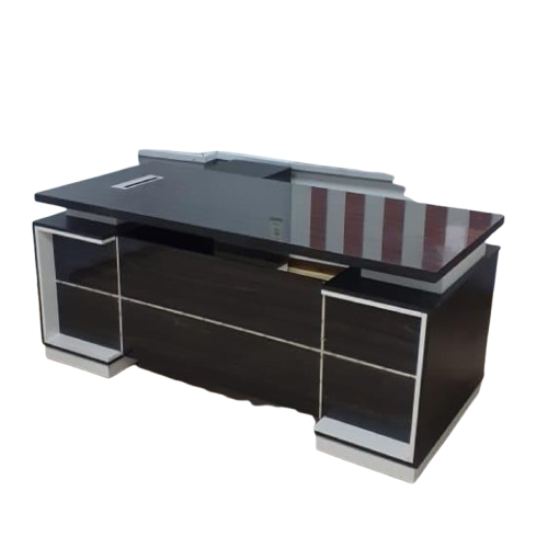 مكتب مدير مودرن على شكل حرف L، وغالباً ما يكون مصنوعاً من الخشب المضغوط (MDF) مع قشرة صناعية مقاومة للخدش، بالإضافة إلى لمسات زجاجية أو معدنية.