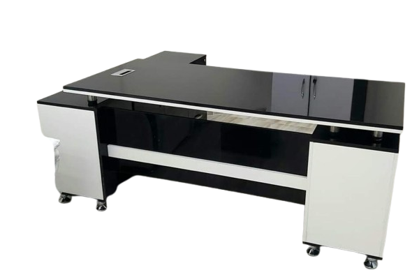 - الخزانة الجانبية: يمكن استخدامها كوحدة إرجاع على شكل حرف L أو كخزانة قائمة بذاتها، وتحتوي على أدراج، ومكان مخصص للكمبيوتر، ورفوف.