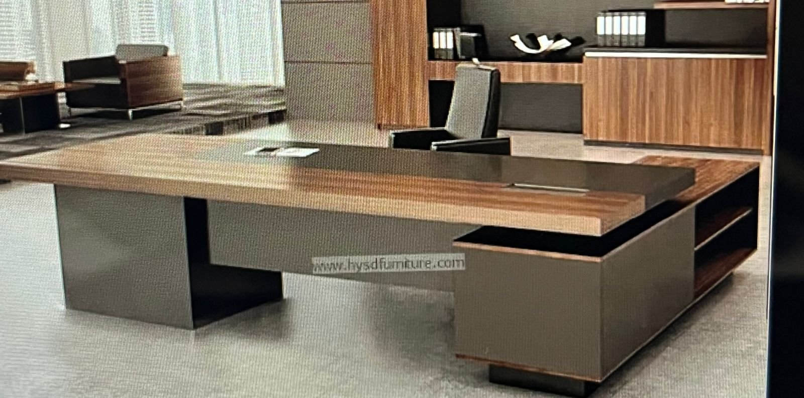 مكتب تنفيذي حديث فاخر بتصميم يجمع بين الخشب باللون البني والأسطح الرمادية الداكنة أو السوداء. يتميز هذا النوع من المكاتب بتصميم عملي وأنيق وواسع، وغالباً ما يكون مصنوعاً من خشب الـ MDF عالي الجودة.