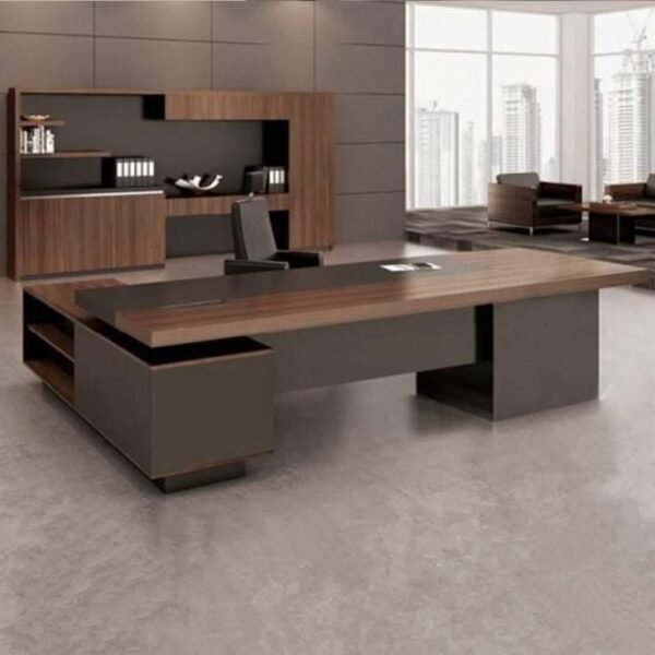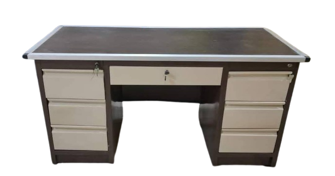 - التصميم: يتميز بتصميم مستطيل كلاسيكي مع أرجل معدنية أو قواعد جانبية مغلقة تحتوي على الأدراج.