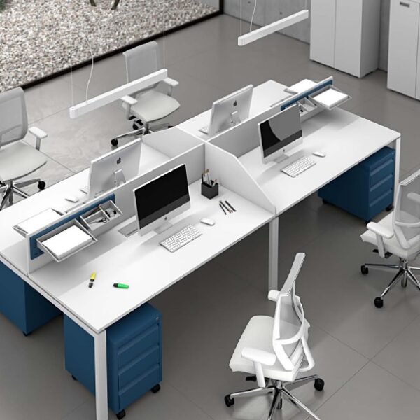 - التصميم: هو مكتب على شكل حرف L يتسع لشخصين متقابلين، ويحتوي على فواصل رأسية (حواجز) لضمان بعض الخصوصية وتقليل التشتيت.